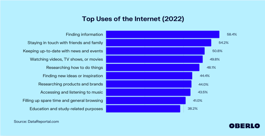 Gaubys, J. (n.d.). What is the internet used for? [Oct 2022 update]. Oberlo. Retrieved November 13, 2022, from https://www.oberlo.com/statistics/what-is-the-internet-used-for