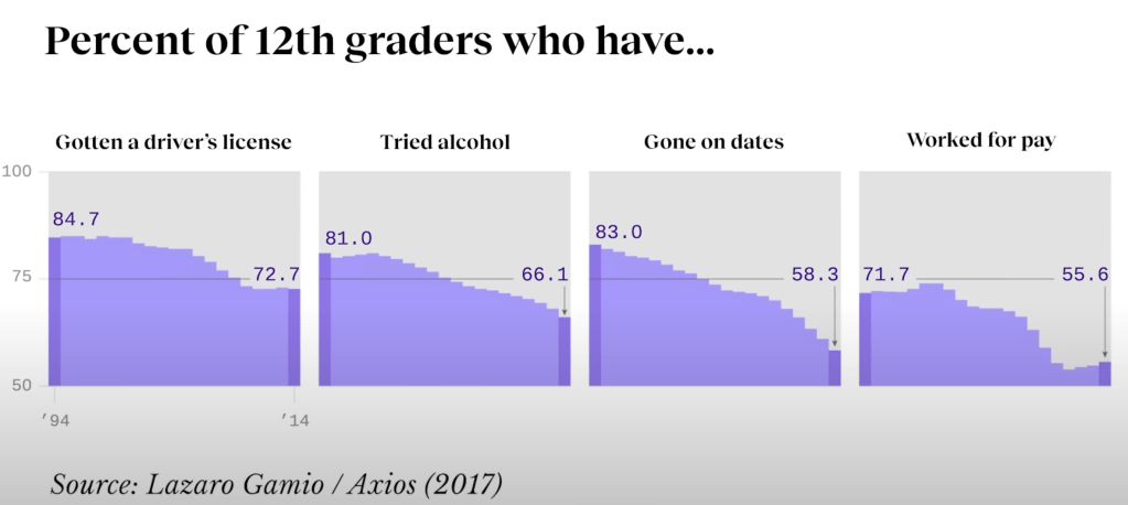 Bu yaş grubundaki kişiler, eski nesillere göre daha az ehliyet başvurusu yapıyor, daha az romantik ilişkiye sahip oluyor, daha az sosyalleşiyor ve daha az para kazanıyorlar. 1994’ten 2014’ kadar yapılan bu araştırmada 20 sene içerisinde tüm bu kategorilerde neredeyse %20’ ye varan gerileme yaşanmış ve giderekte bu rakam gerilemeye devam ediyor.